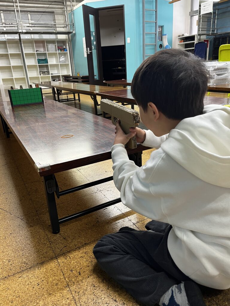 本日は私学児童の朝保育だった為、段ボール製輪ゴム鉄炮を作って射撃特訓を行いました!普段は中々できない遊びに大喜びでした🔫